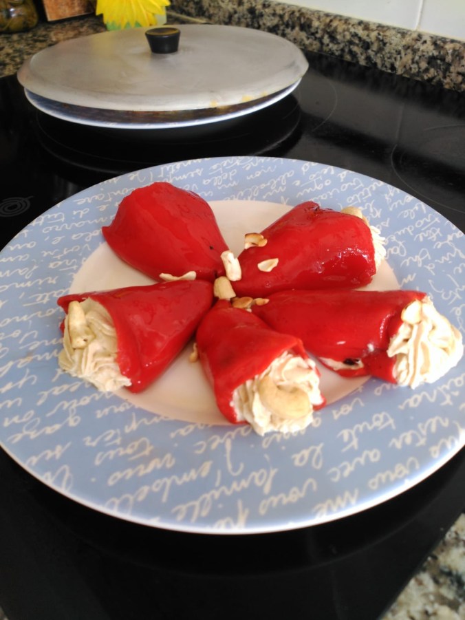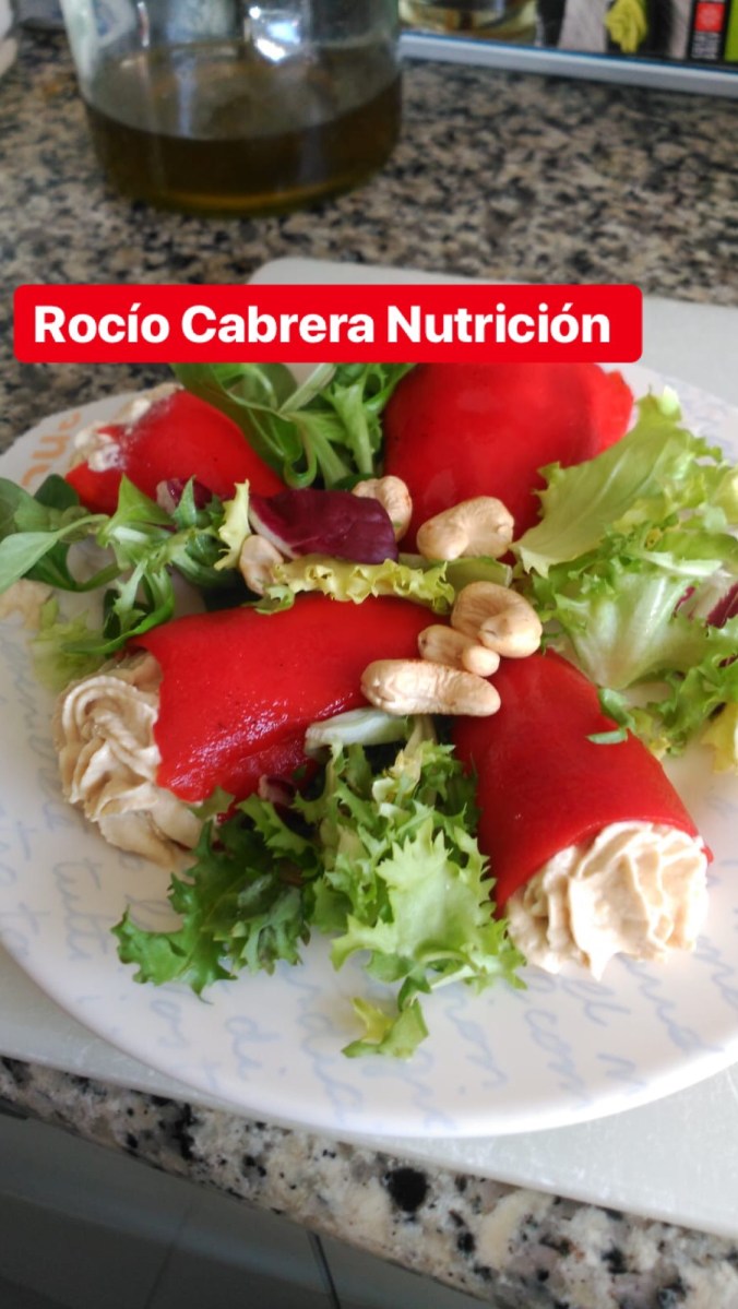 Pimientos del piquillo o morrones rellenos de humus casero, con anacardos y base de brotes verdes