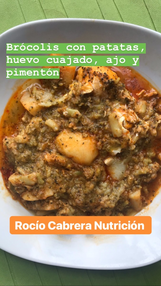 Brócolis con patatas, huevos cuajados, ajo y pimentón.